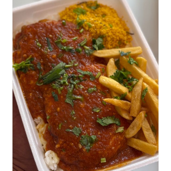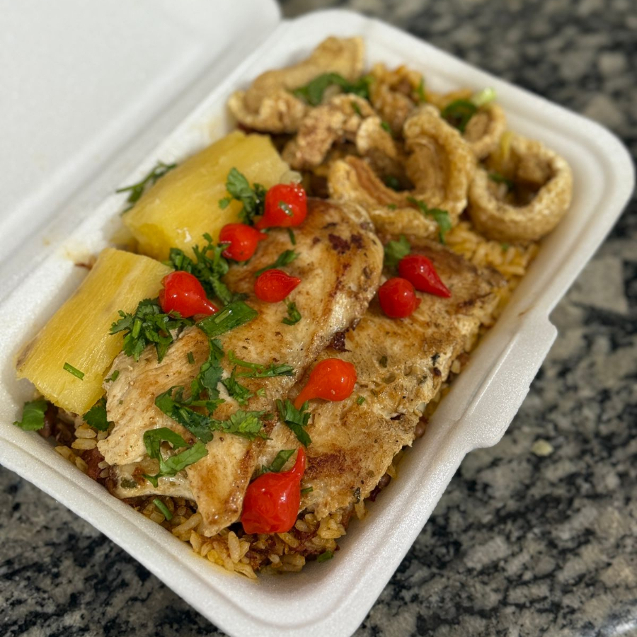 Acompanhamento: Delicioso baiao de dois com file de frango preparado com, arroz, feijão de corda, carne seca desfiada, tomate picado, queijo coalho picado em cubos, torresmo sequinhos, mandioca na manteiga, coentro picado e pimenta biquinho.
