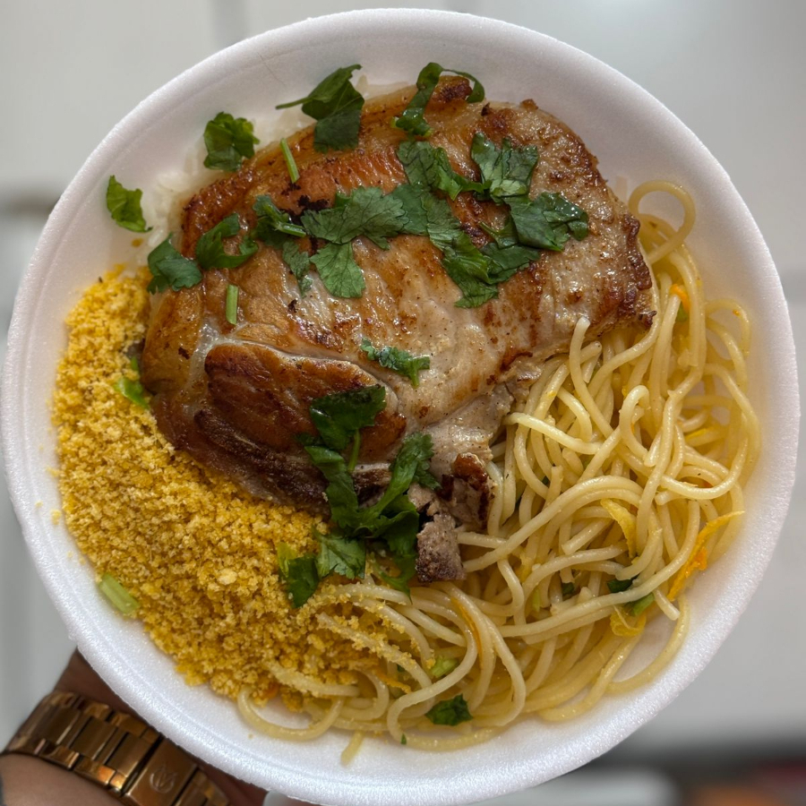 Acompanhamento: arroz, feijão, macarronada, bisteca grelhado, farofa temperada, salada de alface tomate e cebola.