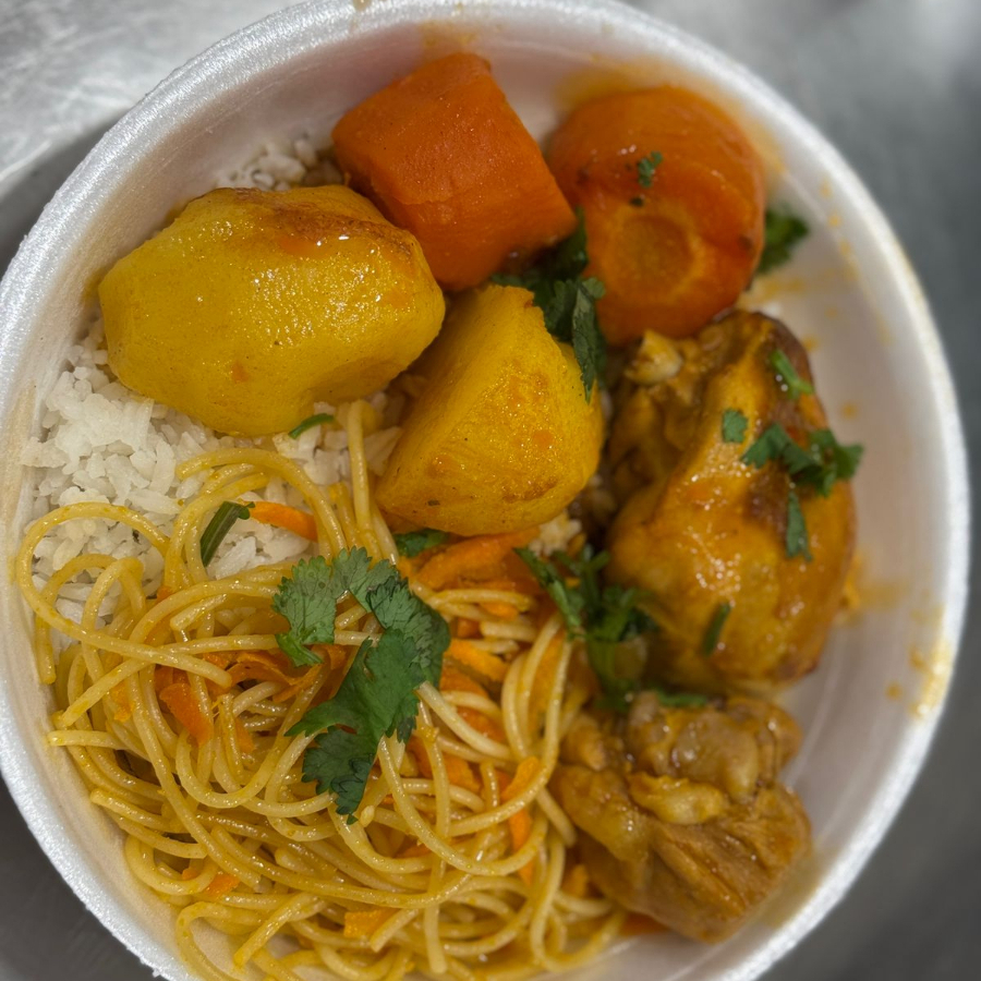 Acompanhamento: arroz, feijão, macarronada, frango ao molho com batata e cenoura, farofa temperada, salada de alface tomate cebola.