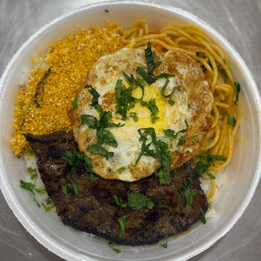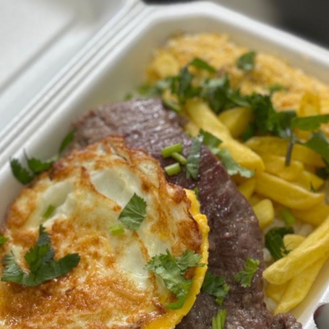 Acompanhamento: arroz, feijão, macarrão, contra file grelhado, ovo frito, batata frita, farofa temperada, salada de alface tomate e cebola.