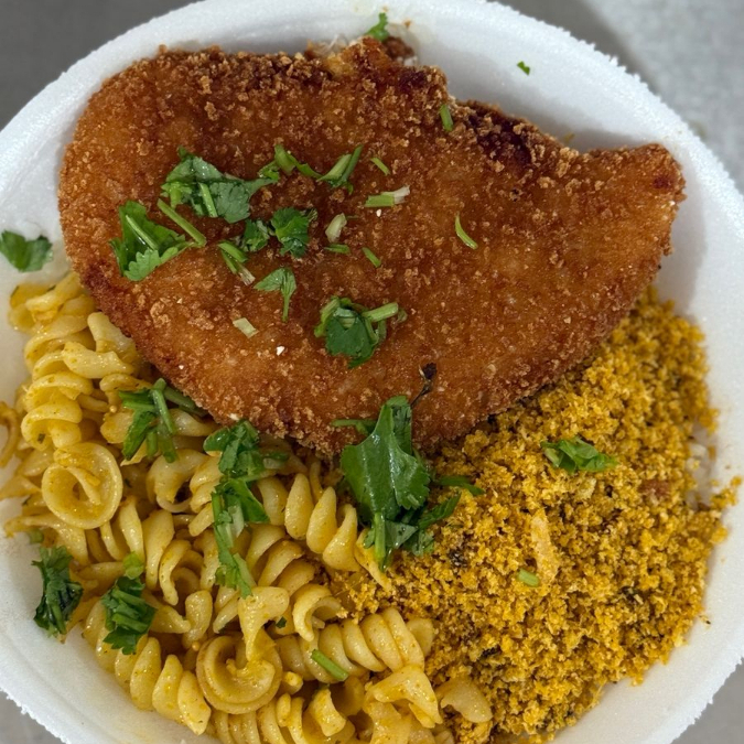 Pamegiana De Frango Com Fritas E Macarrao (seve Muito Bem 1 Pessoa)