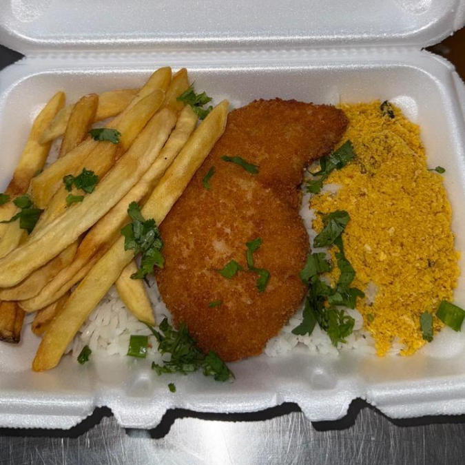 Acompanhamento: arroz, feijão, macarrão, batata frita, filezinho de frango empanado , farofa temperada, salada de alface tomate e cebola.