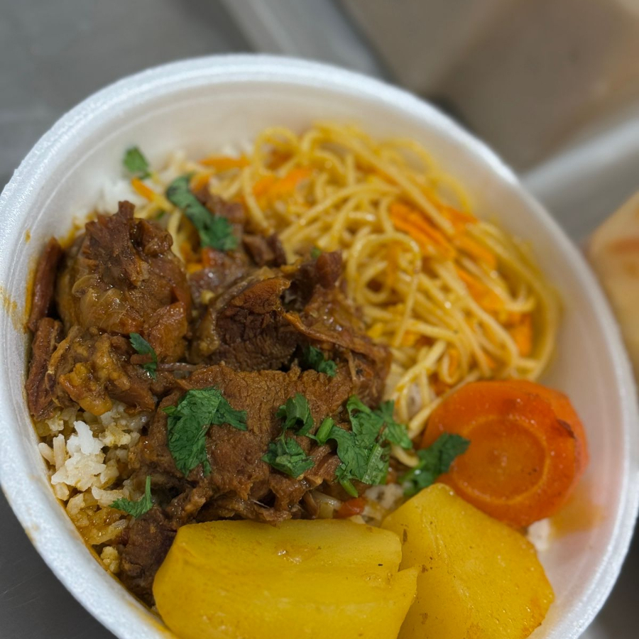 Acompanhamento: arroz, feijão, macarrão, picadinho bouvina com legumes, farofa temperada, salada de alface tomate e cebola.
