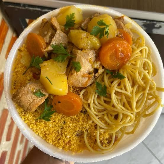 acompanhamento: arroz, feijão, macarrão, picadinho no molho, farofa temperada, legumes de batata e cenoura e salada de alface tomate e cebola.