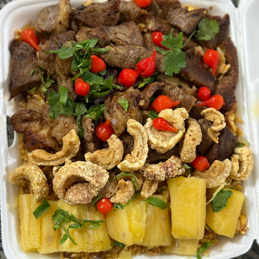 Acompanhamento: Delicioso baiao de dois com 1 bife de contra file preparado com, arroz, feijão de corda, carne seca desfiada, tomate picado, queijo coalho picado em cubos, torresmo sequinhos, mandioca na manteiga, coentro picado e pimenta biquinho.
