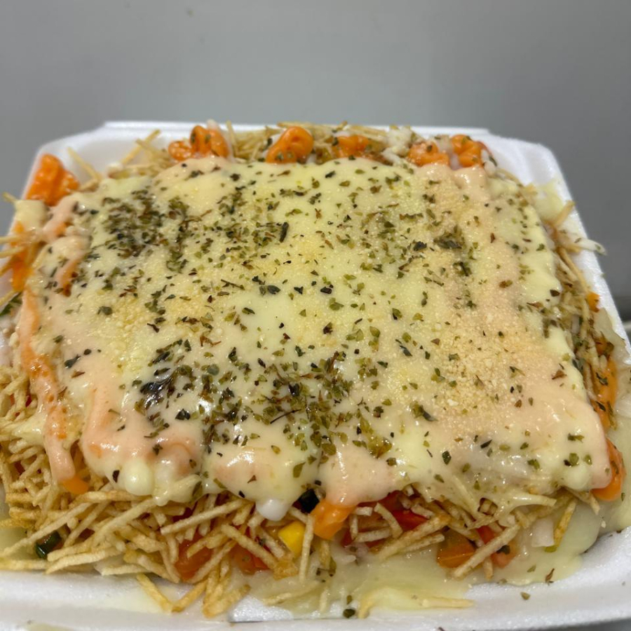 Acompanhamento, contra filé em tiras, queijo, vinagrete de tomate cebola e coentro, cheddar, catupiry e maionese verde.
