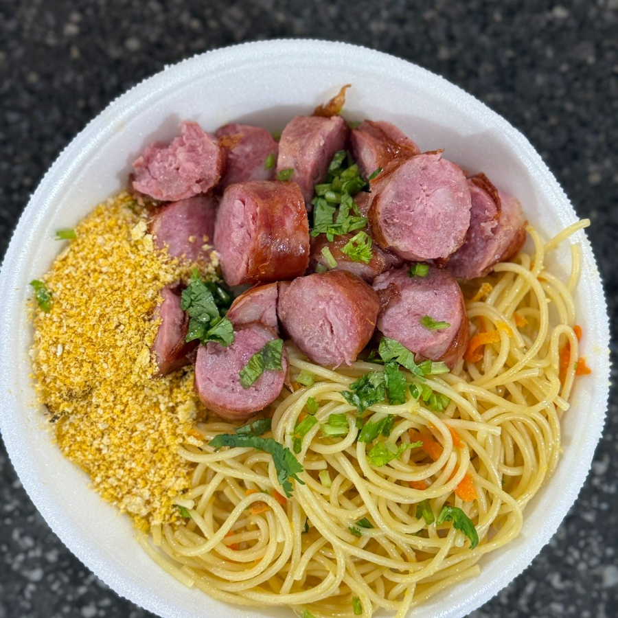 acompanhamento: arroz, feijão carioca, macarronada, linguiça toscana frita, farofa e salada de alface tomate e cebola.