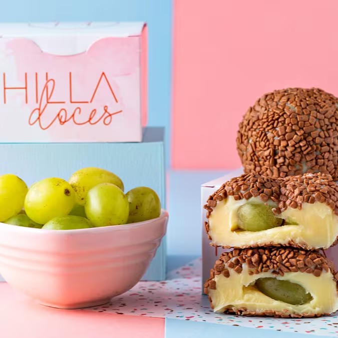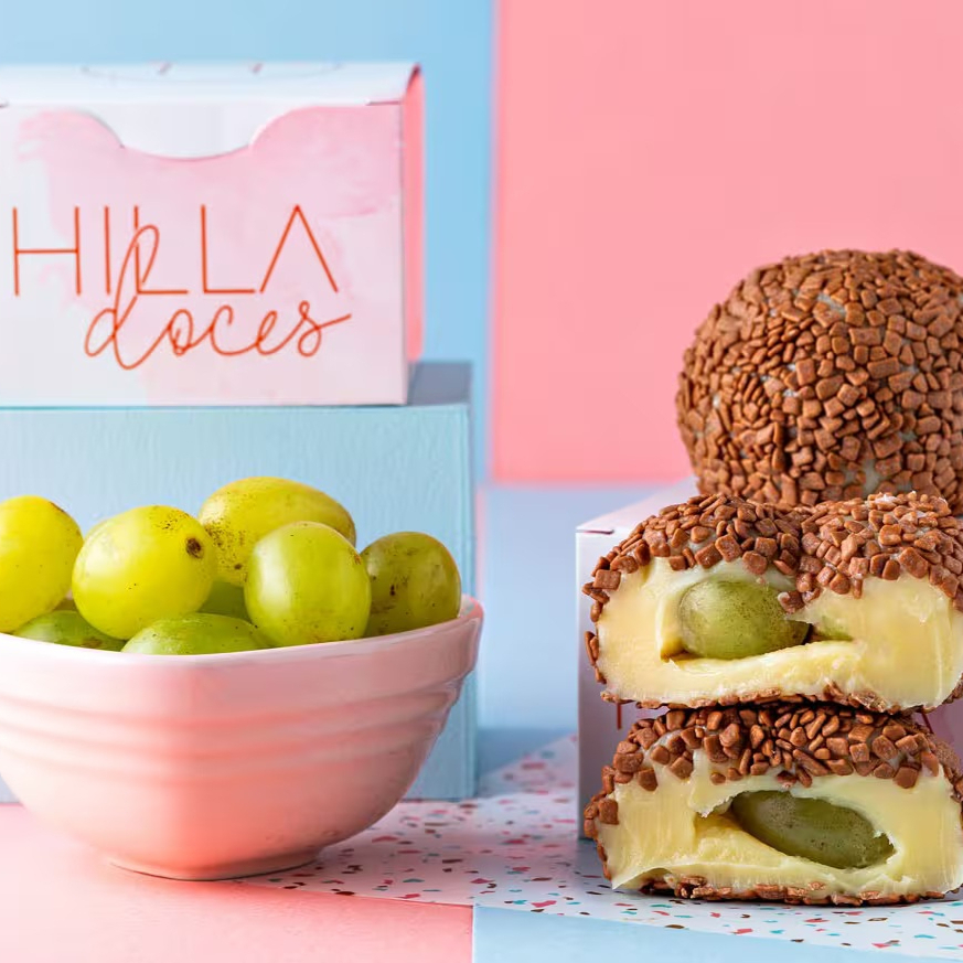 Combinação perfeita entre a refrescância das uvas com a doçura do nosso brigadeiro branco envolto no confeito belga ao leite.