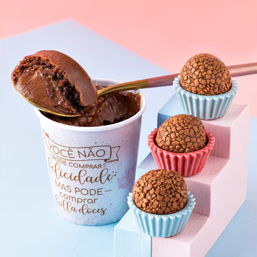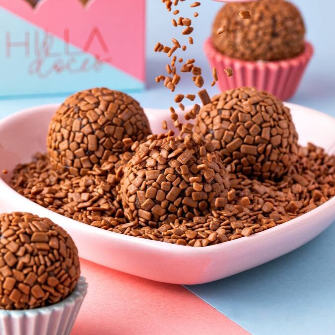 O brigadeiro da Hilla é perfeito para quem ama chocolate. Contém duas unidades de 20g cada de brigadeiro envolto no confeito ao leite belga.