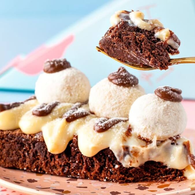 Massa de brownie com chocolate meio amargo com cobertura de brigadeiro branco cremoso, Nutella e Ninho, finalizada com três brigadeiros brancos de Ninho.