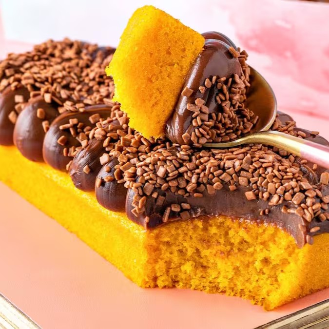 Bolo caseiro com massa de cenoura e cobertura de brigadeiro tradicional cremoso, finalizado com confeito belga.