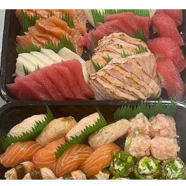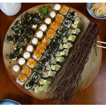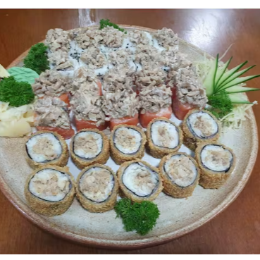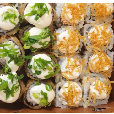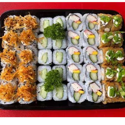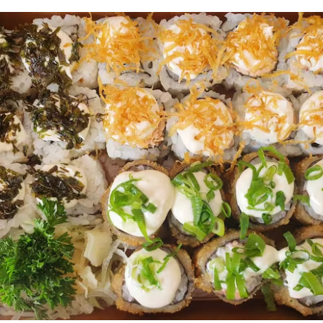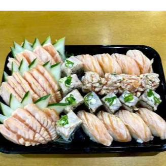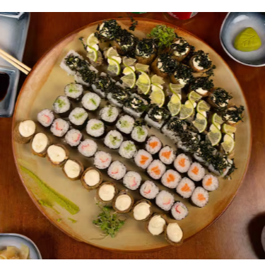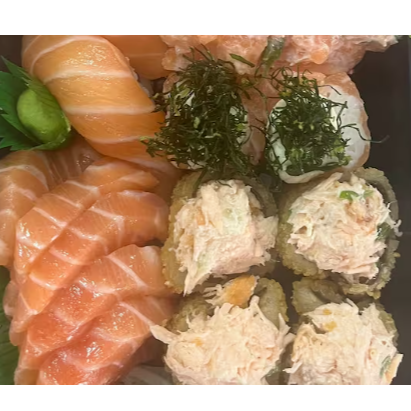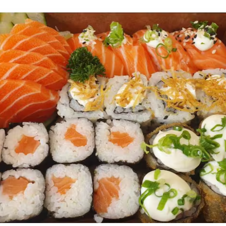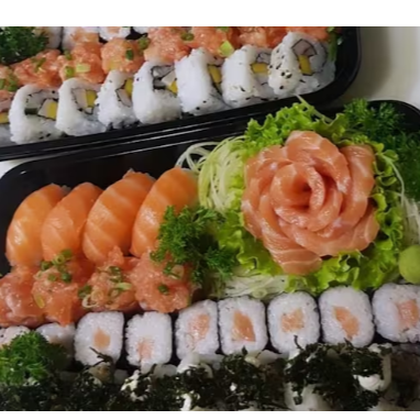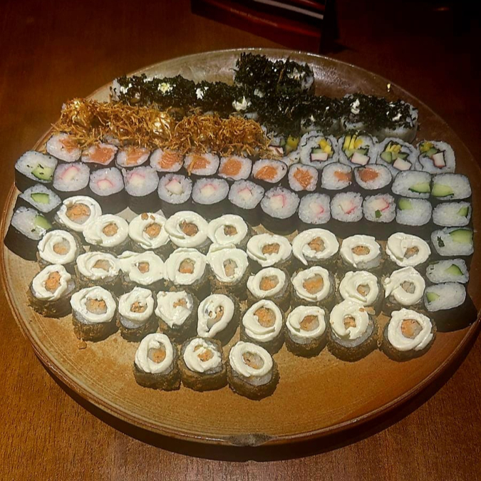 10 hot rolls 10 sashimis(5 salmao ,5 peixe branco) 10 hossomakis (salmao,5kani) 10 uramakis(5 skim,5california) 10 niguiris (5 salmao,5 skin) 2 sushi jhou 8 sushi doce
