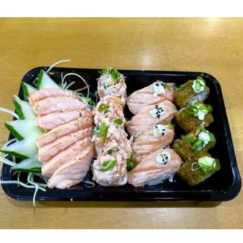 5 sashimis salmão, 4 niguiris salmão, 4 hot roll salmão, 4 uramakis salmão grelhado com batata,8 salmonmakis. (Não é possivel alterar os itens do combo)