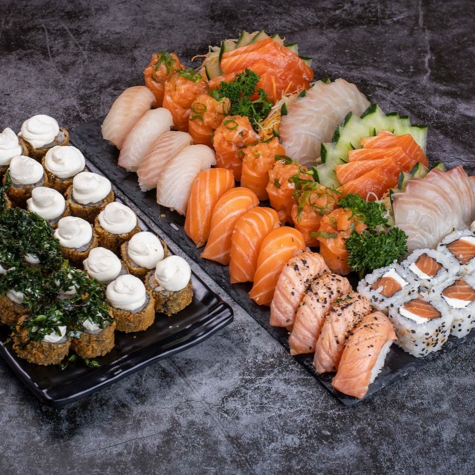 6 sashimi de salmão 5 jhou de salmão 5 niguiri de salmão 5 hossomaki de salmão 5 uramaki de salmão 5 uramaki califórnia 5 hossomaki pepino