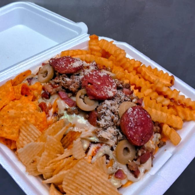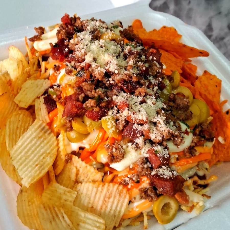Pão de hotdog, 3 salsichas, purê, vinagrete, milho, ervilha, batata palha, carne moída, calabresa fatiada, azeitona, Doritos, Ruffles, parmesão, bacon, molho verde, tártaro, billy jack, cheedar, Catupiry,catchup, mostarda, maionese, mussarela e batata frita.