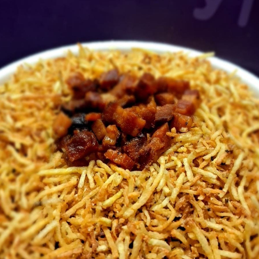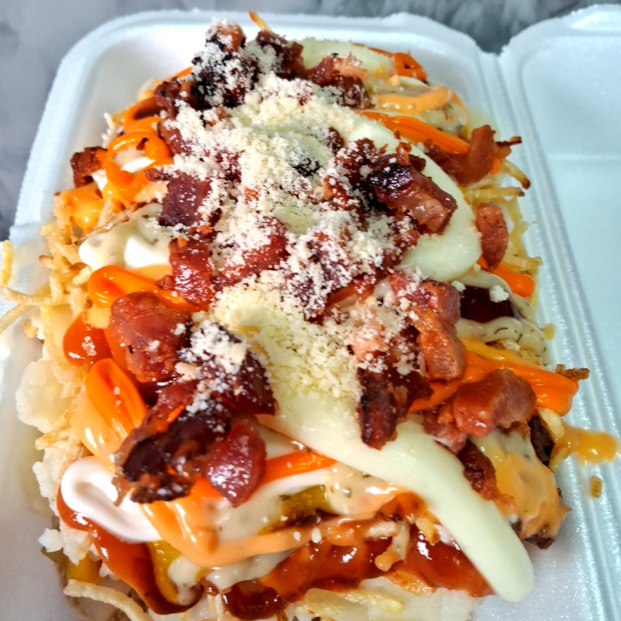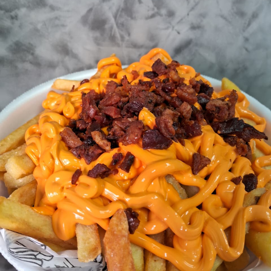 Porção de batatas fritas crocantes e sequinhas com cheddar cremoso e bacon bem fritinho.