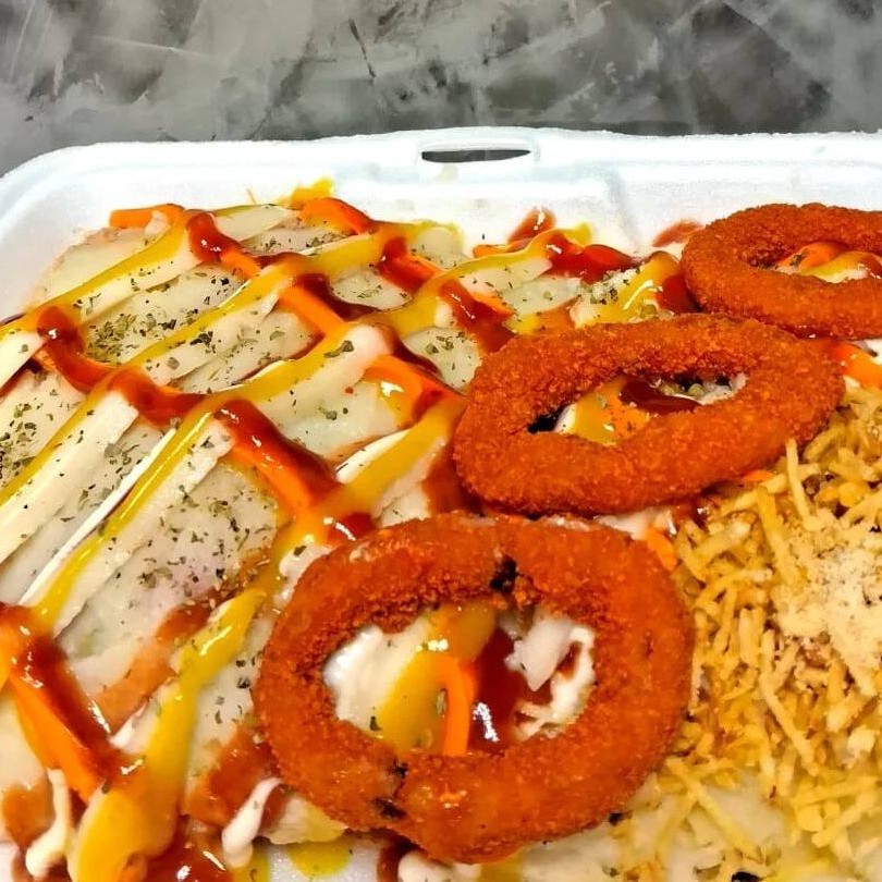 '' O Tal Do Dogão'' Ingredientes : 2 pães, 4 salsichas, milho, ervilha, vinagrete, purê de batata, batata palha, parmesão, catchup, mostarda, maionese, Catupiry, cheedar, orégano e Onions Rings.