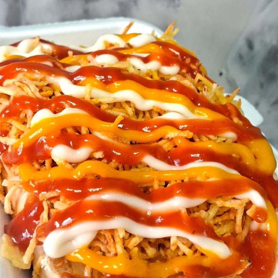 Pão de hotdog ,1 salsicha, pure, batata palha, vinagrete, cheedar, Catupiry, molho tártato , molho barbecue,molho billy jack , maionese, mostarda, catchup e parmesão.