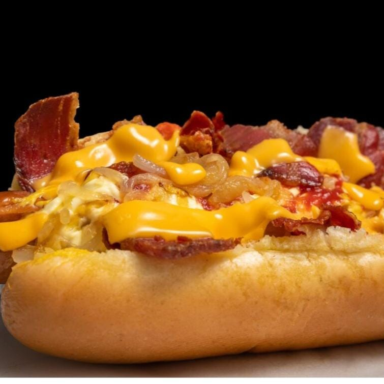 Incrível e saboroso Hot Dog Cheddar Bacon que acompanha 2 salsichas, vinagrete tradicional, catchup, mostarda, maionese,purê de batata cremoso, batata palha, cheddar, e bacon.