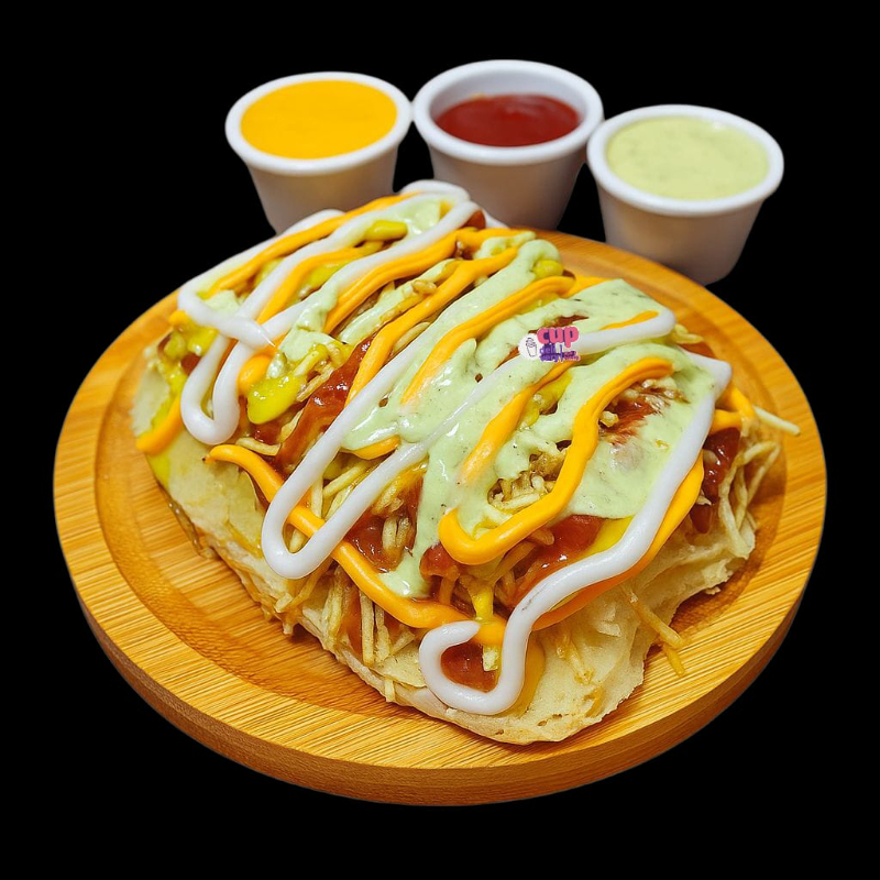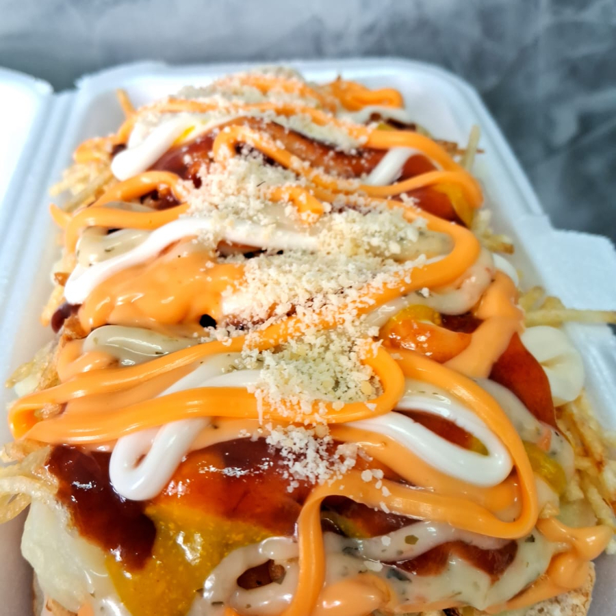 Um pão, duas salsichas, milho, ervilha, vinagrete, catchup, mostarda, maionese, purê de batata, batata palha, cheddar,Catupiry e parmesão.