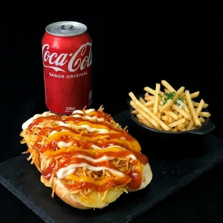 Pão de hotdog,1 Salsicha, Catupiry, catchup, maionese, mostarda,purê de batata,vinagrete, milho, ervilha e batata palha.