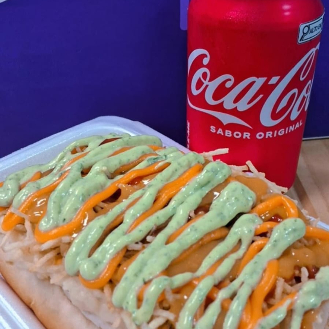 Delicioso Hot Dog tradicional com 2 salsichas, vinagrete, milho verde, purê de batata cremoso, catchup, mostarda, cheddar, catupiry, maionese verde e batata palha no Pão de Dog + 01 Coca-Cola Lata de 350ml bem geladinha.