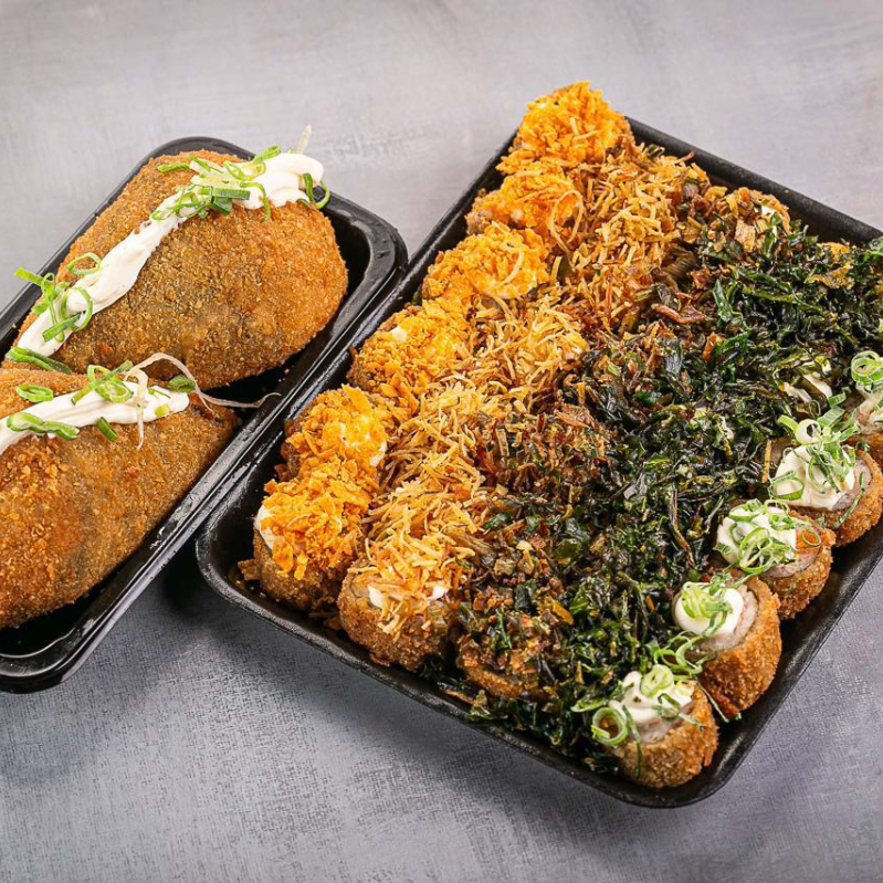 10 uramaki com Doritos, 10 uramaki com couve, 10 uramaki com batata, 10 uramaki com cream cheese