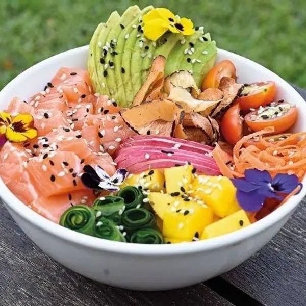 Salmão, cebola roxa, tomate cereja, sucos cítricos, pimenta dedo de moça e cebolinha.