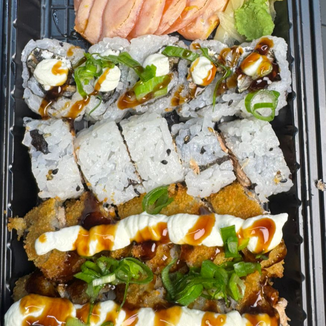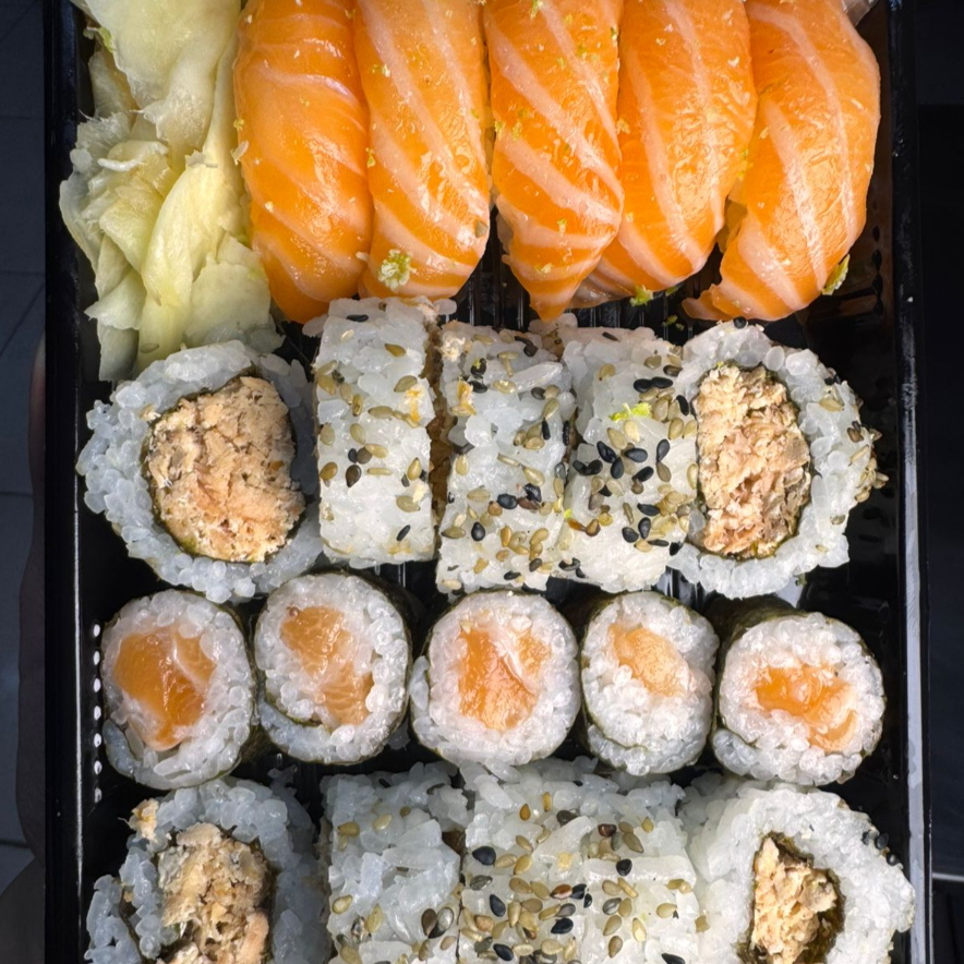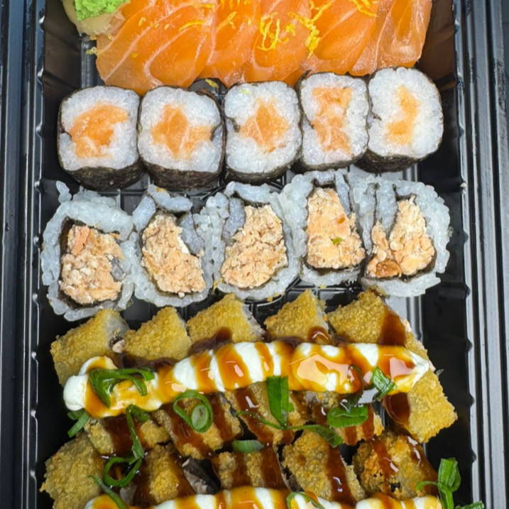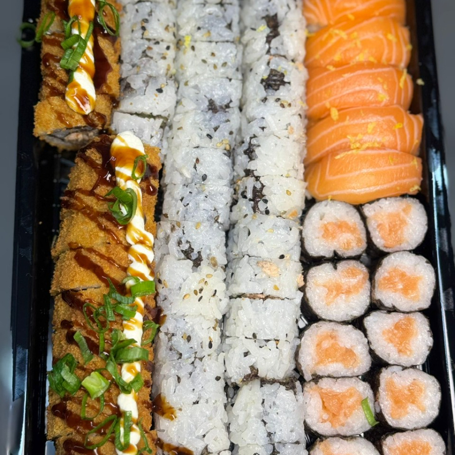 15 hot holl + 10 uramaki de salmão + 10 hossomaki de salmão + 5 niguiris + 10 uramaki skin + 10 uramaki california