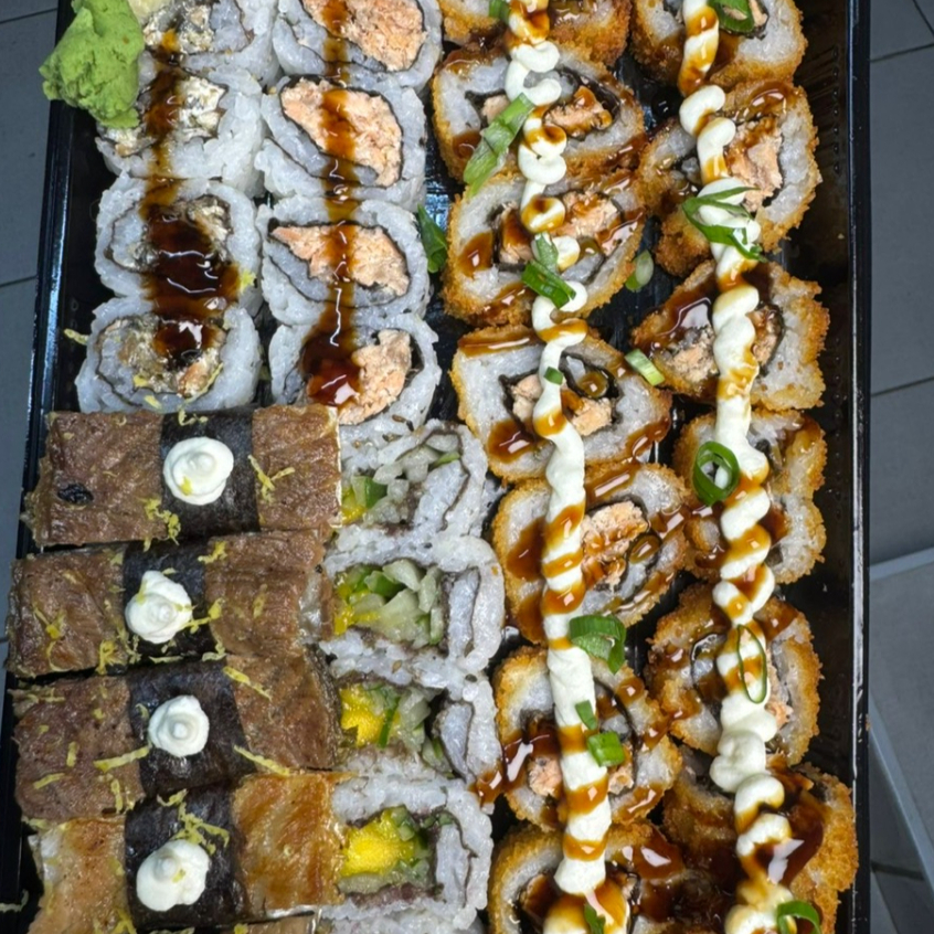 10 hot holls + 5 uramaki grelhado + 5 niguiris skin + 5 uramakis skin + 5 hot couve + 5 uramakis califórnia