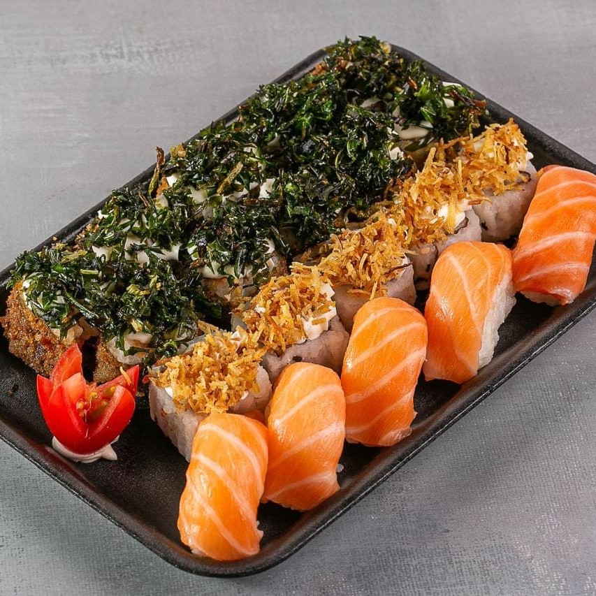 10 hot roll com couve crispy, 5 niguiri de salmão, 5 uramaki filadélfia com batata crispy