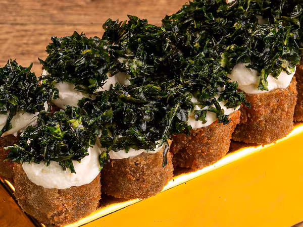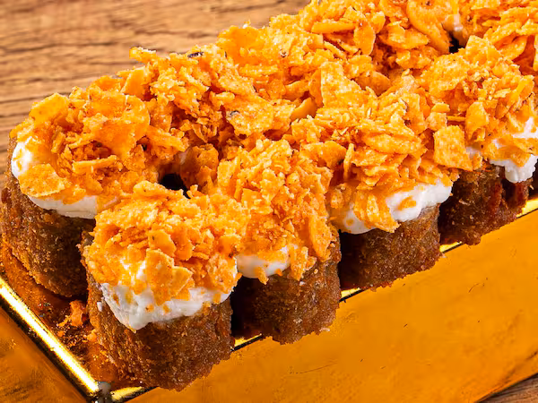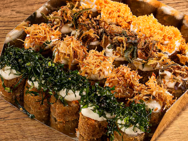 Filadélfia, shari, nori, farinha Panko, creme cheese e cebolinha