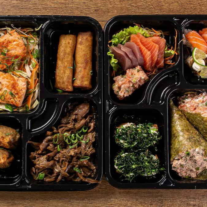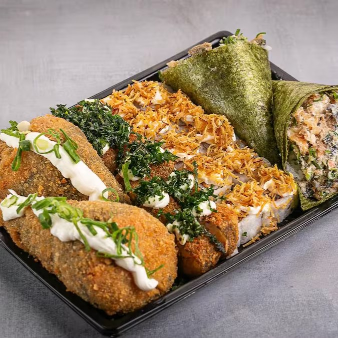 10 uramakis de salmão 8 sashimis de salmão 10 jhou de salmão 10 hossomaki de salmão 10 hossomaki de kani 5 uramakis skin com couve Crispy 5 uramakis skin com Doritos
