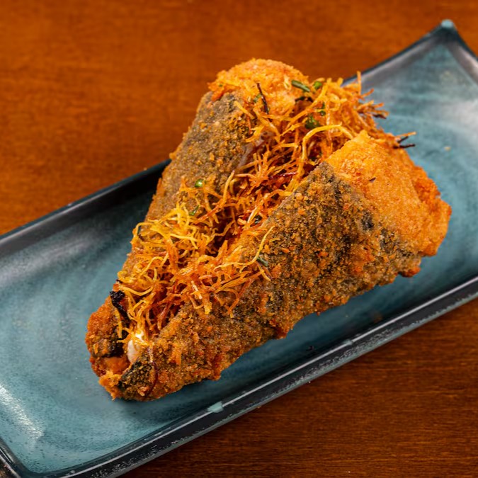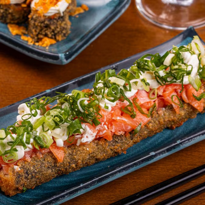 salmão grelhado, cream cheese, nori, arroz e batata crispy