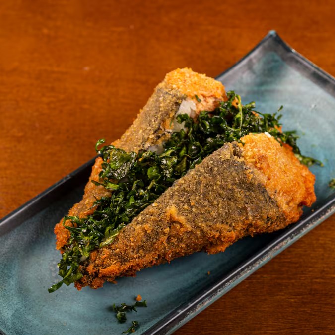 salmão grelhado, cream cheese, nori, arroz e couve crispy