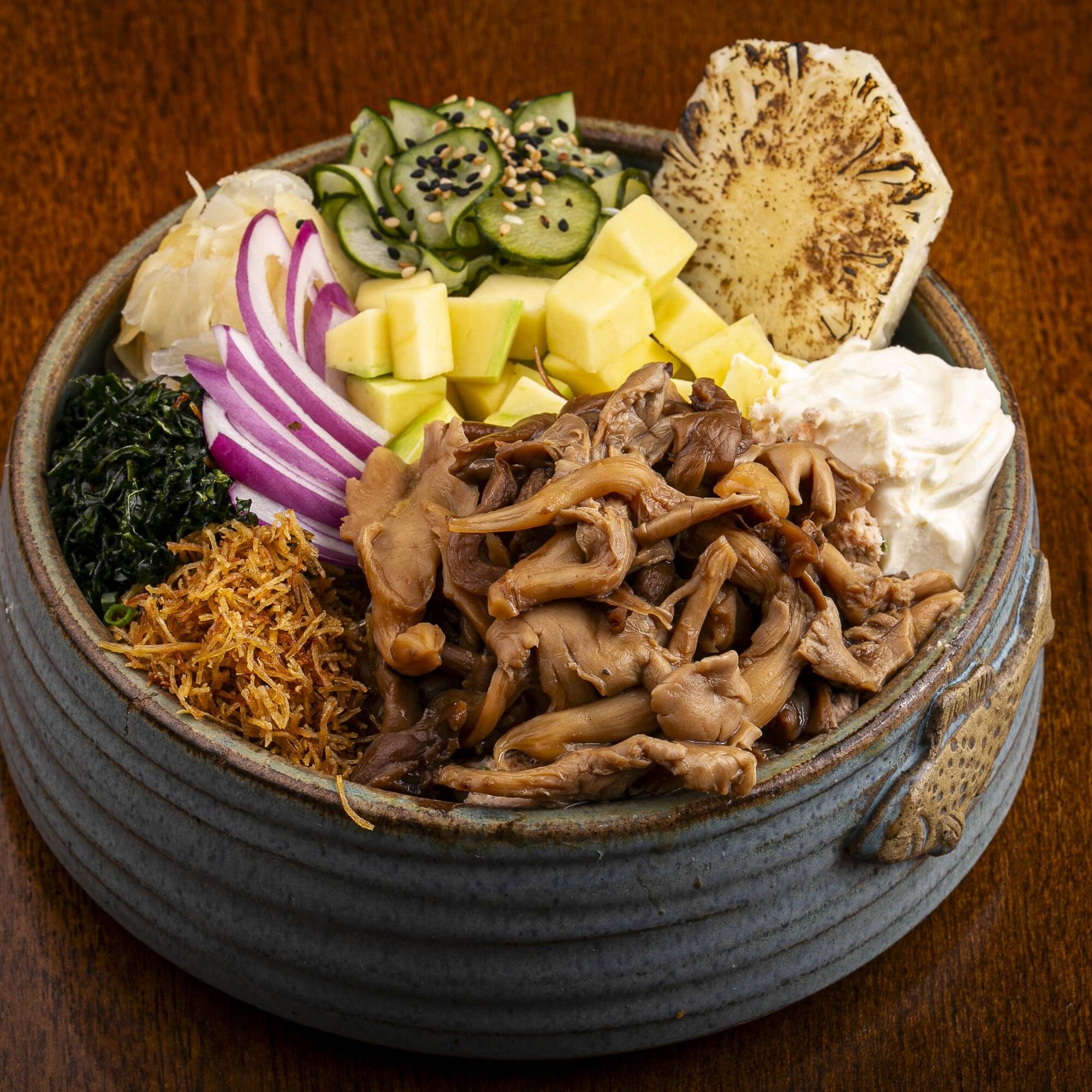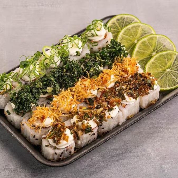 SHIMEJI, MANGA, PEPINO, ABACAXI, CREAM CHEESE, BATATA CRISPY, COUVE CRISPY, GENGIBRE, E CEBOLA ROXA(MANDAMOS SHOYU, TARÊ E HASHI)