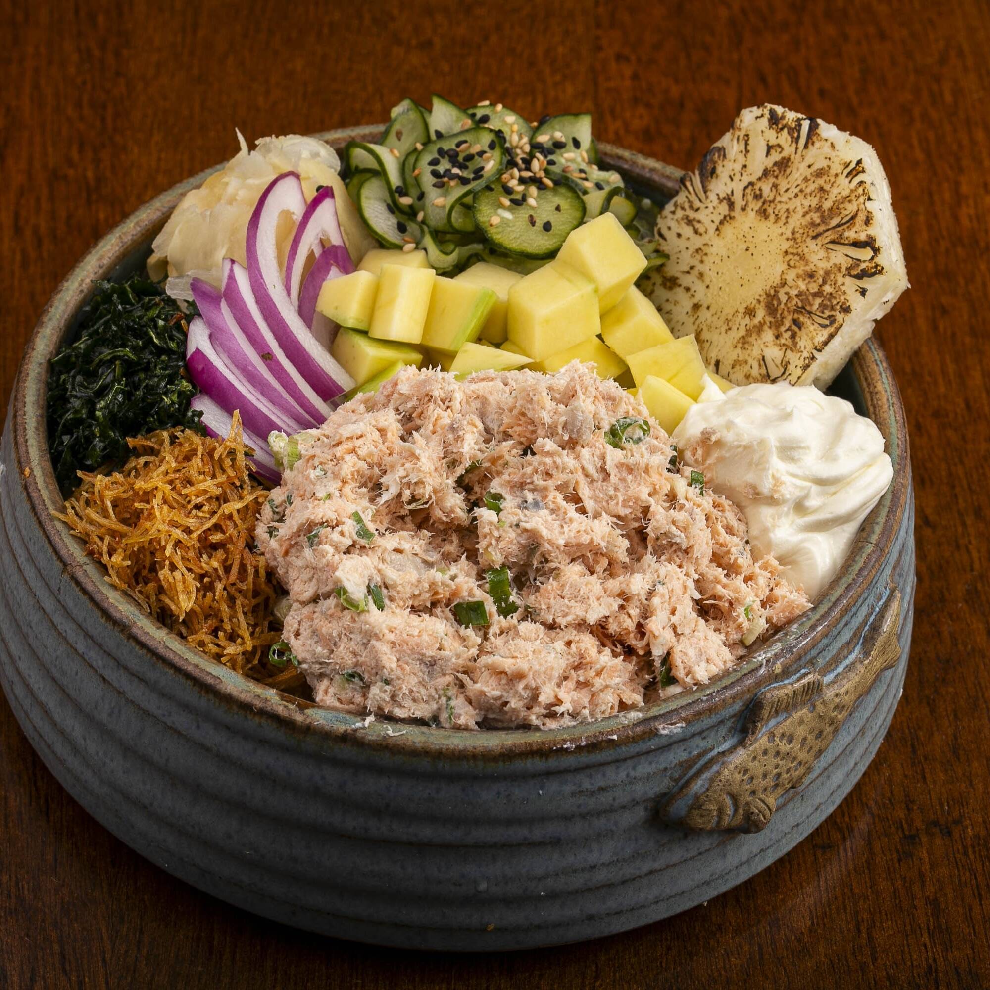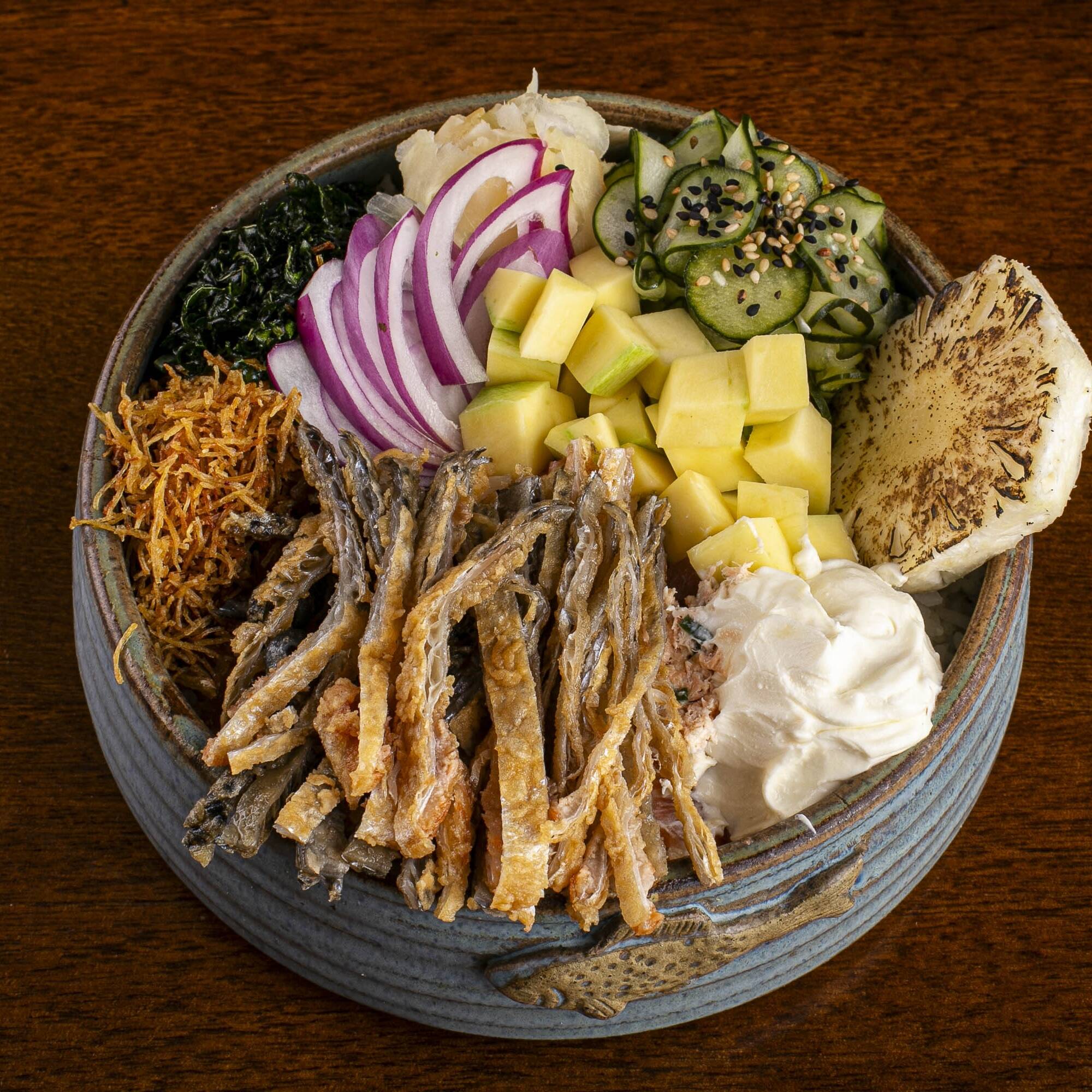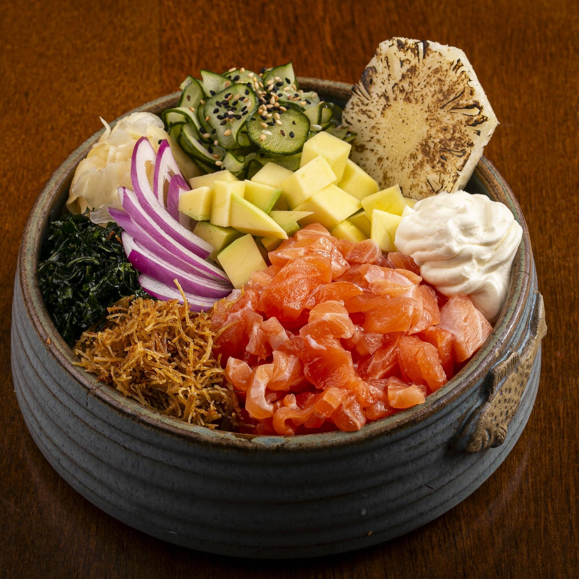 SALMÃO GRELHADO, MANGA, PEPINO, ABACAXI, CREAM CHEESE, BATATA CRISPY, COUVE CRISPY, GENGIBRE, E CEBOLA ROXA(MANDAMOS SHOYU, TARÊ E HASHI)