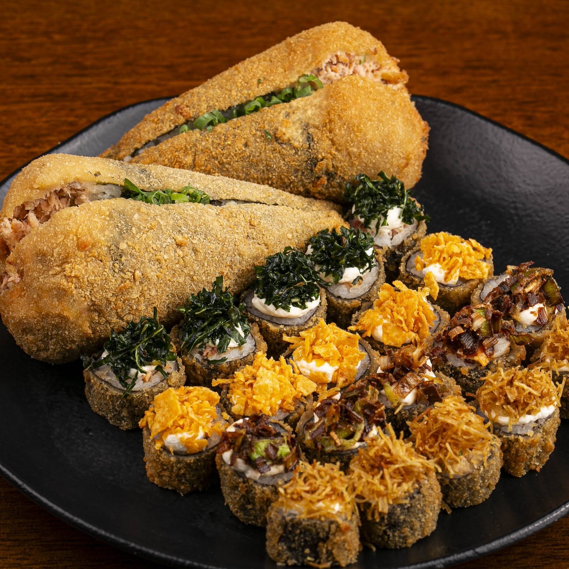 20 salmomaki, 20 hot holl com couve crispy, 20 uramaki filadelfia com batata crispy, 20 kanimaki, 20 uramaki de salmão, 16 sashimi de salmão.