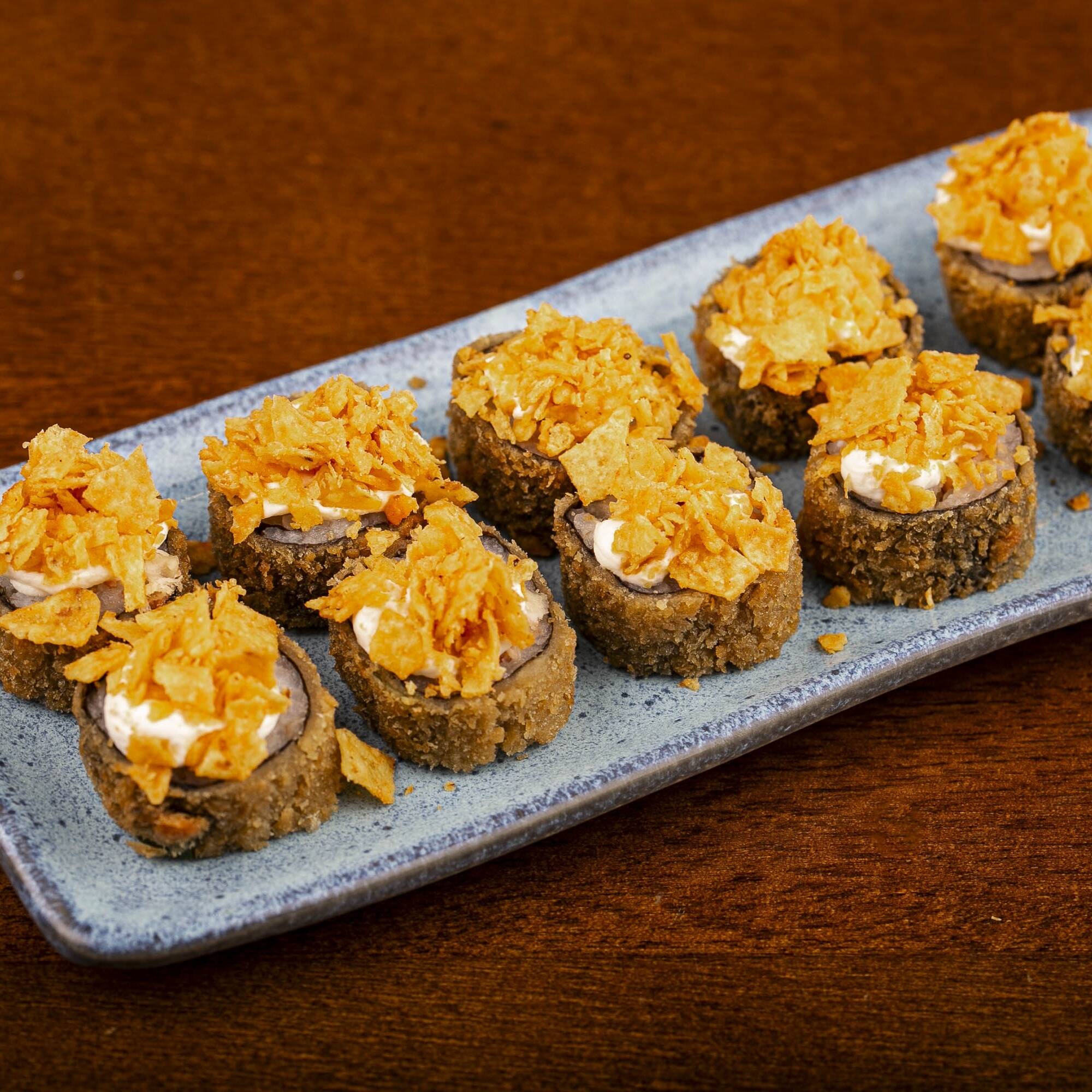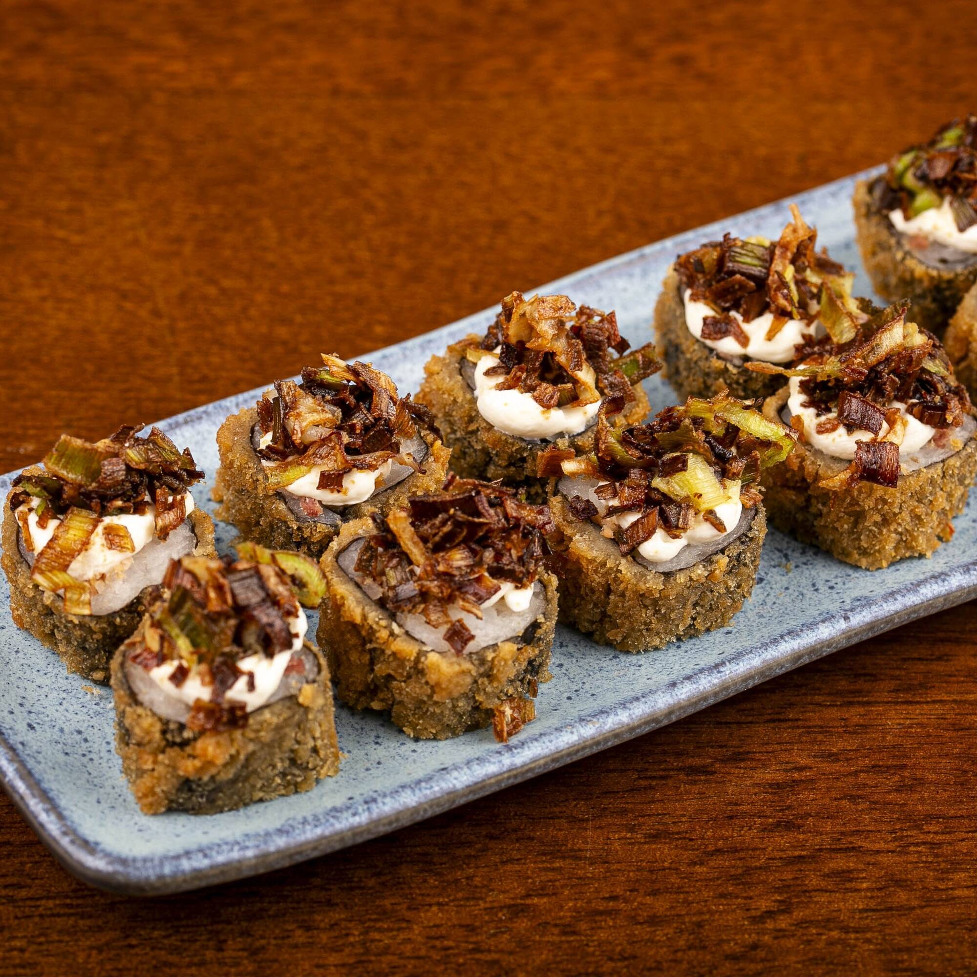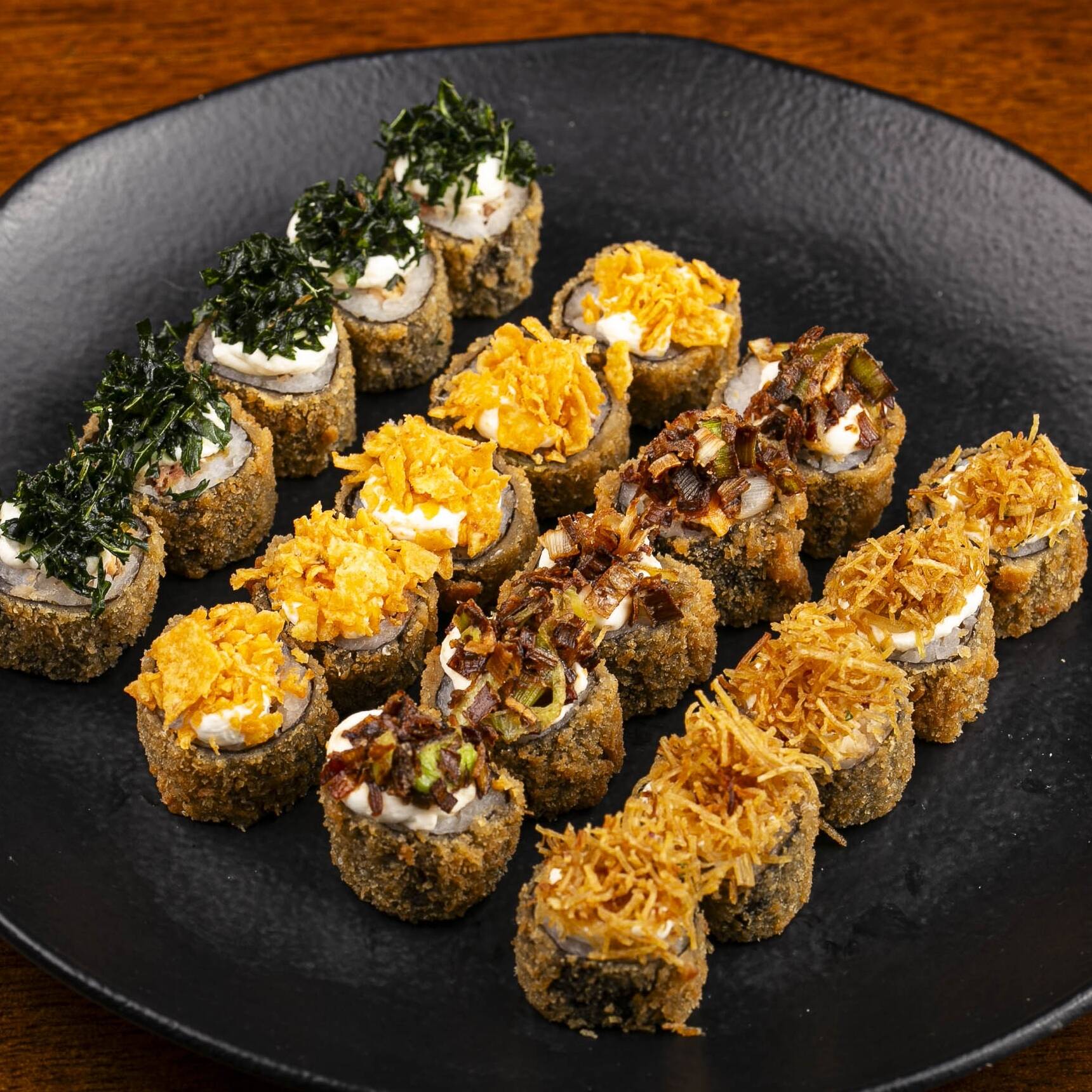 Filadélfia, shari, nori, farinha Panko, creme cheese e cebolinha