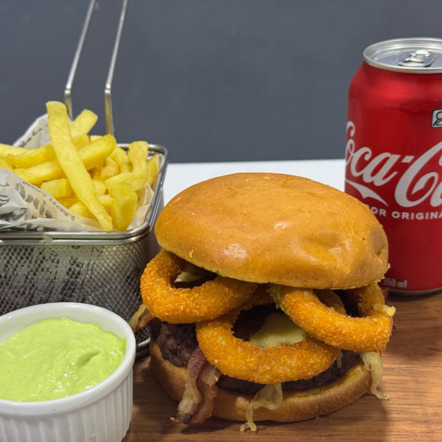 Pão brioche, 1 blend de 160 g, maionese da casa, queijo, onion rings e bacon