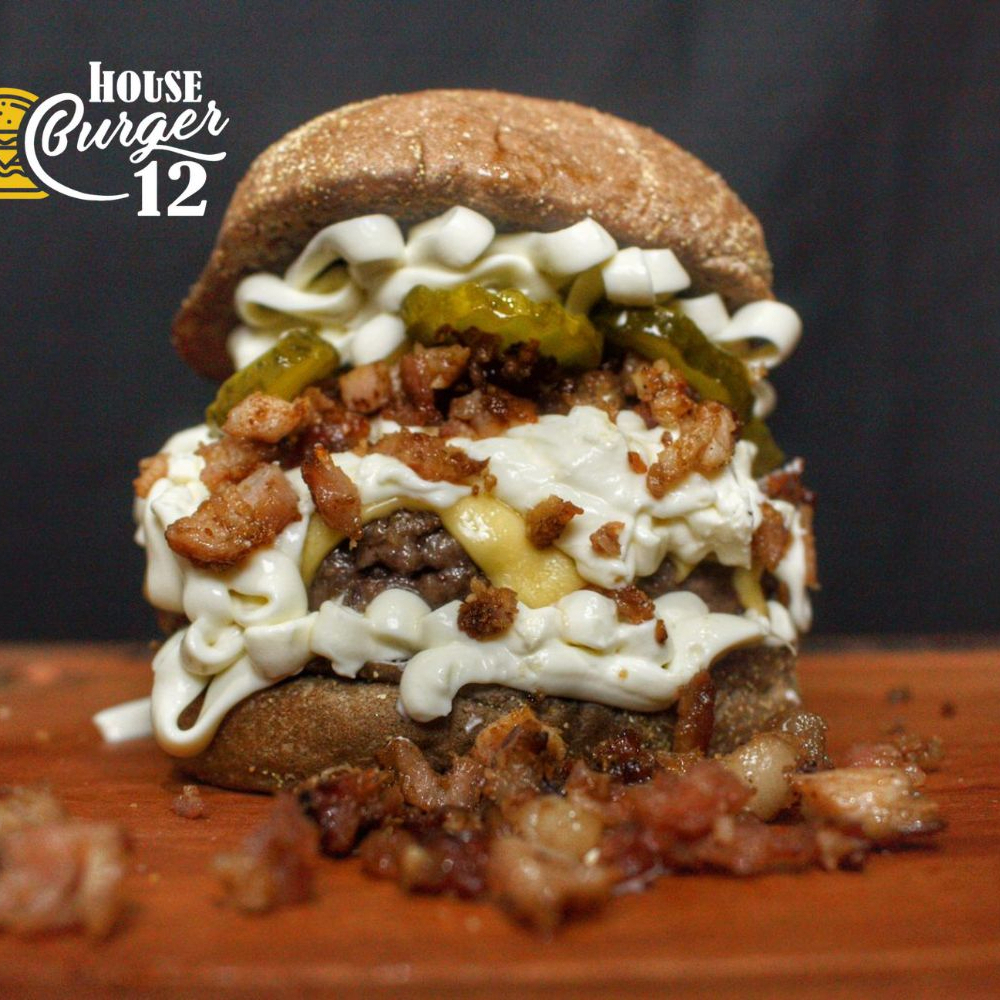 Pão brioche, 1 blend de 160g, queijo, salada, cebola roxa, bacon e maionese da casa