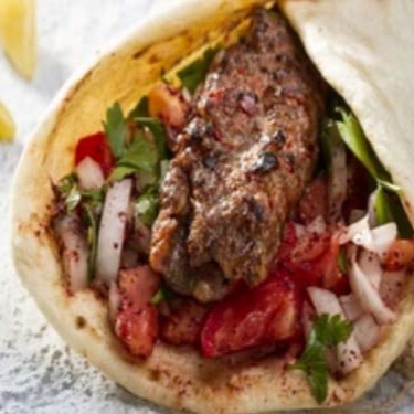 Pão árabe torrado tamanho grande, cortado em quatro pedaços. Recheado com kafta (135g)., árabe grelhada, cebola, tomate grelhado e molho de alho caseiro