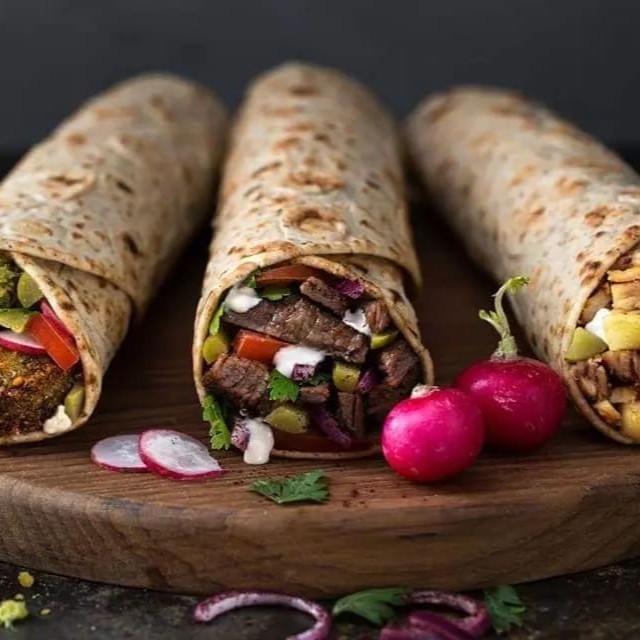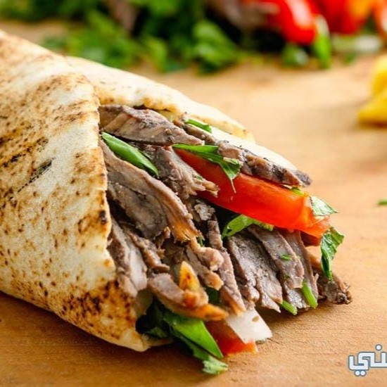 Um lanche árabe tradicional de carne ( tiras de contra filé) com especiarias árabe servidas com: pão sírio 30 cm (grande) , carne temperado, tomate, cebola,salsa, picles , alface, molho de alho e molho de tahini dentro do lanche)