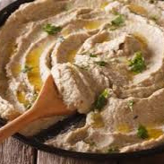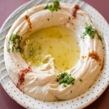Pasta de grão-de-bico. Acompanha fatias de pão sírio.