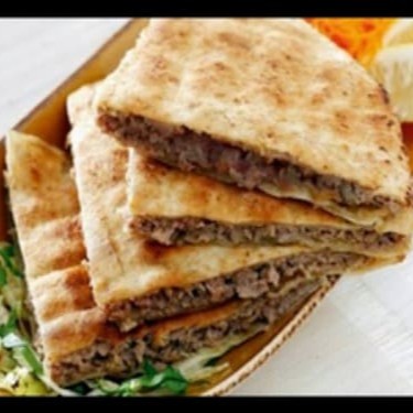 Pão árabe torrado tamanho grande, cortado em quatro pedaços. Recheado com kafta (125g) árabe grelhada,c/queijo mussarela, cebola, tomate grelhado e molho de alho caseiro