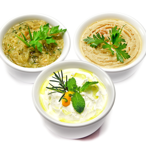 Homus, babaganuche e labneh ( 100g cada) para degustar todas e querer mais, aproveite. Acompanha fatias de pão sírio. (300g)