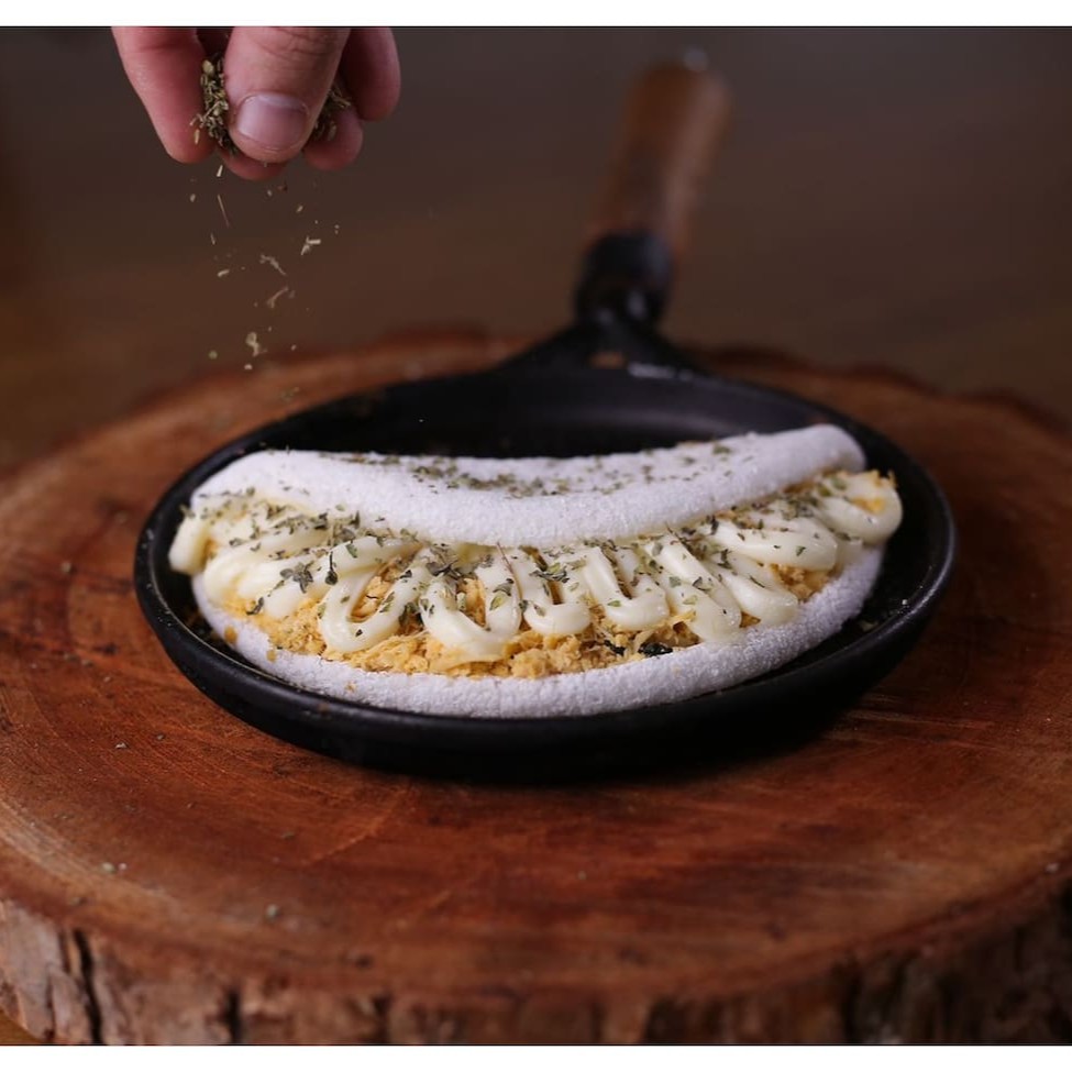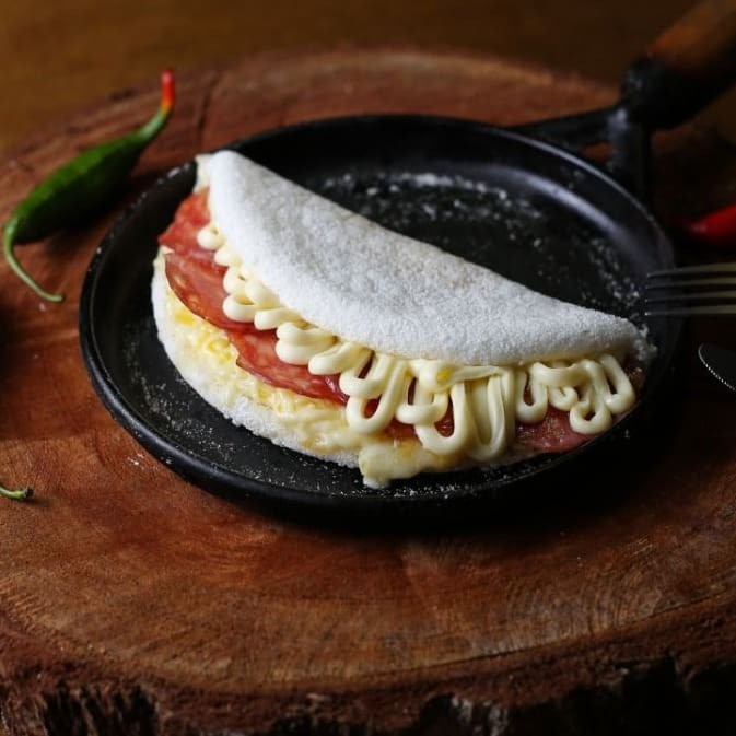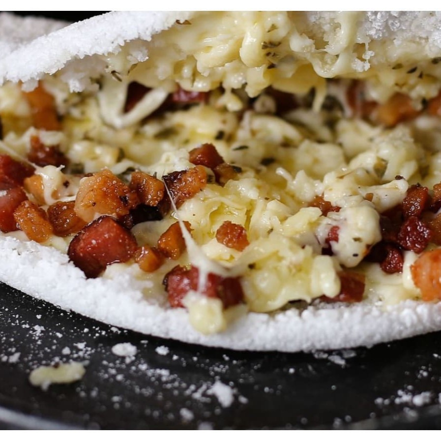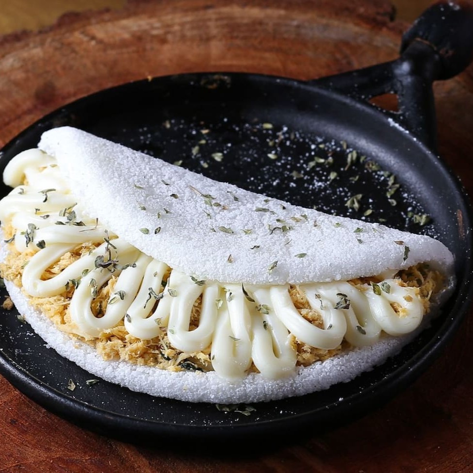 Maravilhosa tapioca de massa artesanal muito recheada com Calabresa ralada, Tomate, Catupiry e Mussarela derretida, com um toque de orégano