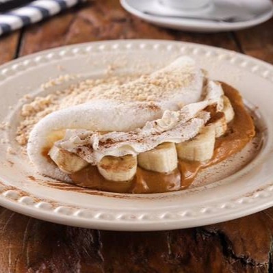 Maravilhosa massa artesanal muito recheada com doce de leite , biscoito maizena triturado ,bananas fatiadas , creme de ninho e um toque de chantily.