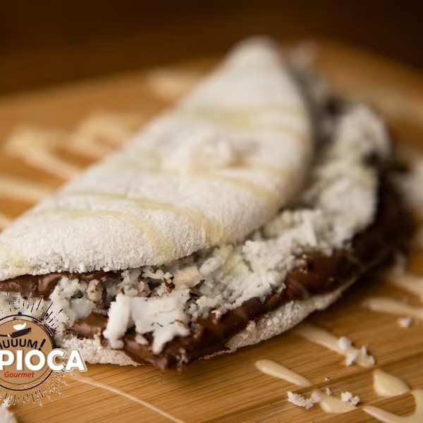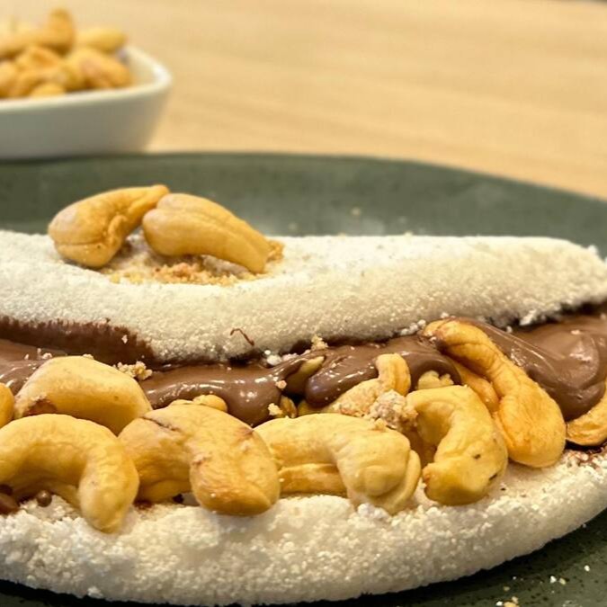 Apresentamos uma irresistível Tapioca Premium, com uma massa artesanal criteriosamente preparada. Muito recheada, esta delícia conta com uma generosa camada de Nutella, conferindo um sabor único e inconfundível. Acompanhada por castanhas de caju, cuidadosamente selecionadas, que adicionam um toque crocante e sofisticado ao prato. Uma experiência gastronômica inigualável, que combina doçura e textura de maneira sublime. Uma opção perfeita para quem busca uma refeição saborosa e repleta de personalidade.