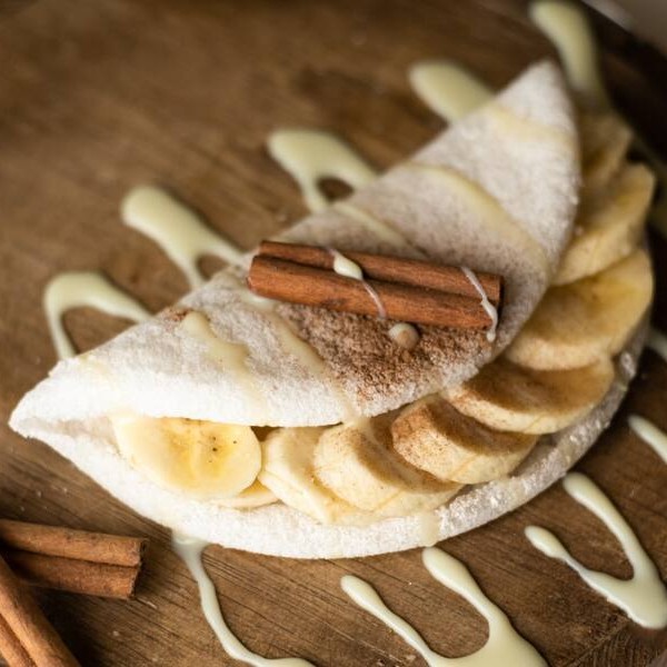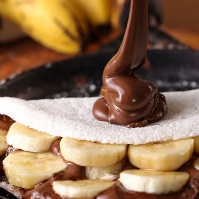 Maravilhosa massa artesanal de crepioca recheada com bananas selecionadas e muita Nutella .